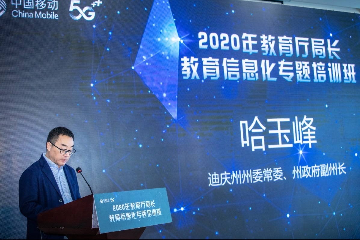 迪庆州州委常委、州政府副州长哈玉峰为开班仪式致辞,他表示迪庆州重点突出精准政策,扎实推进产业扶贫、教育扶贫等扶贫和项目落地,为实现迪庆州全面脱贫打好教育基础。同时迪庆州政府大力推进教育信息化转型发展,通过集中国家、政府、企业的多方力量,尤其是中国移动对迪庆州教育信息化扶贫方面的大力支持,相信未来迪庆州一定会迈上新的台阶。