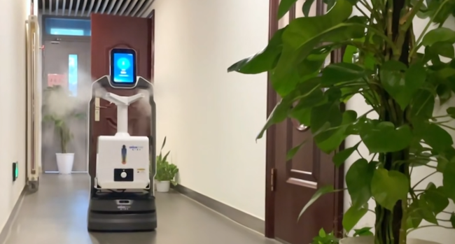 除此之外,消毒豹还可以进行语音巡检。在消毒过程中进行语音报播,宣传消毒知识、防疫须知等宣传内容,一机多用。它还具备一些进阶功能,如:口罩检测、讲解接待、环境巡检、自主导航、精准避障以及云端数据管理,填补了市场上关于“智能交互 移动”型服务机器人的空白。