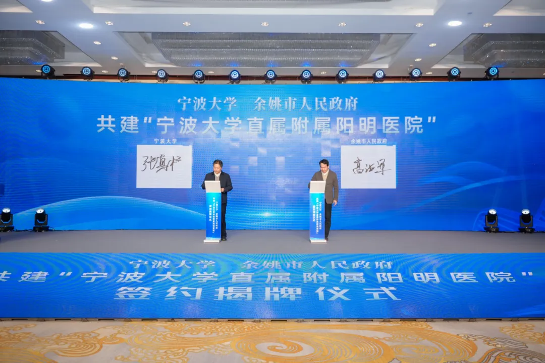 12月18日下午,宁波大学、余姚市人民政府合作共建宁波大学直属附属阳明医院签约揭牌仪式举行。宁波大学校长、中国科学院院士蔡荣根,余姚市委副书记、市长沃勇特,宁波大学党委副书记张真柱,宁波市卫健委副主任夏冠斌,宁波大学党委委员余怡春、顾耀东,余姚市委常委、组织部部长郎客宾,余姚市委常委、常务副市长高海军等领导参加签约揭牌仪式。仪式由余姚市副市长林体主持。