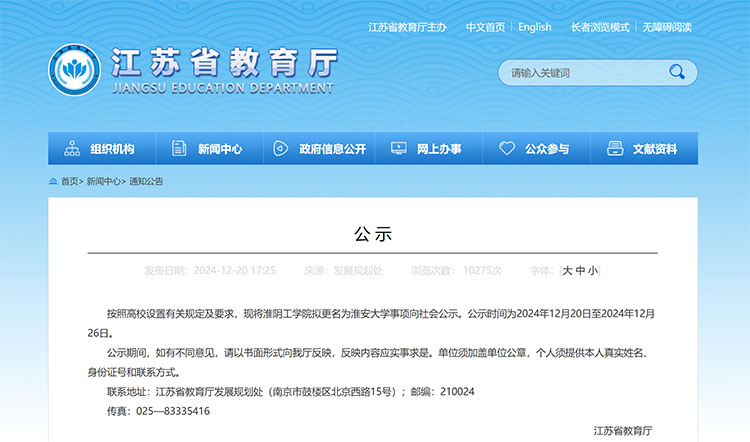 12月20日,江苏省教育厅发布公示,按照高校设置有关规定及要求,现将淮阴工学院拟更名为淮安大学事项向社会公示。公示时间为2024年12月20日至2024年12月26日。