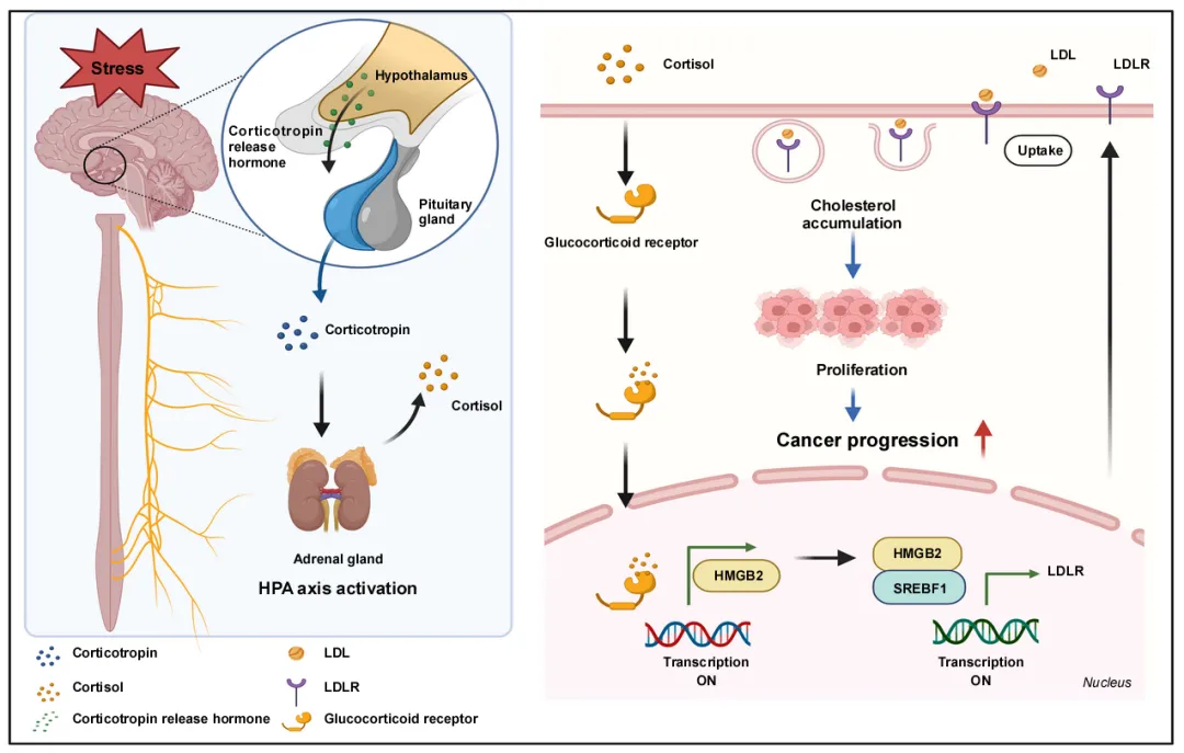 机制图:慢性压力通过释放皮质醇激活gcr-hmgb2-ldlr轴,导致胆固醇代谢异常,促进escc的发生和发展。