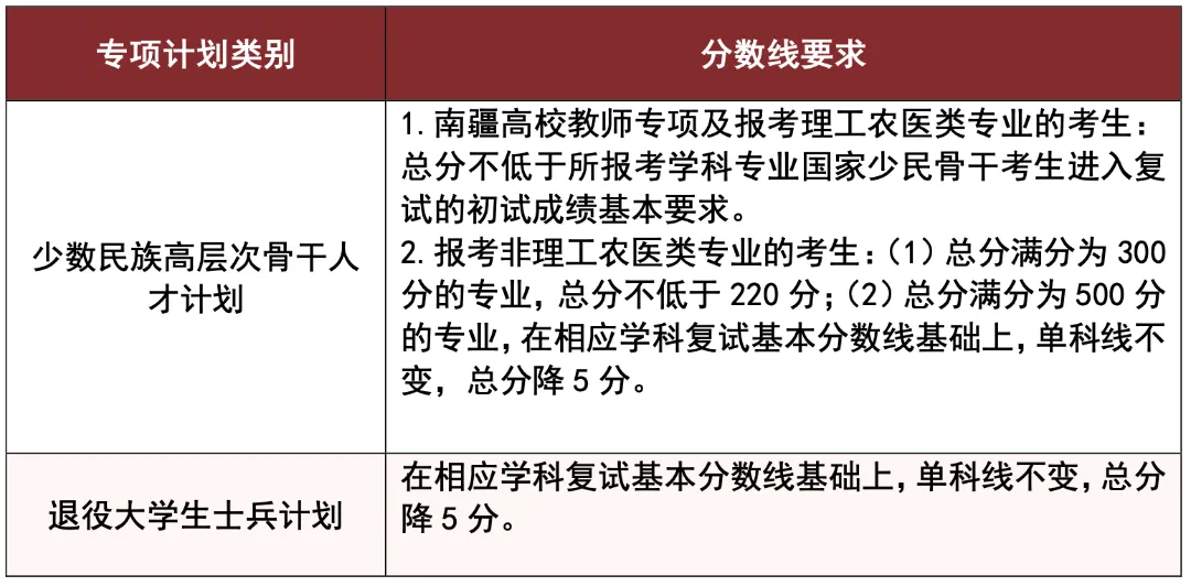 3.我校少数民族照顾政策按照教育部《2025年全国硕士研究生招生工作管理规定》执行。工作单位在国务院公布的民族区域自治地方,且定向就业原单位的少数民族在职人员考生,申请享受照顾政策的,须在网上报名时按要求填报相关信息。未按规定申报或审核未通过的,不享受照顾政策。学校将根据考生材料和有关部门反馈的名单进行审核。审核通过者可在相应普通计划学科分数线基础上总分降5分或一门单科降5分,考生在享受照顾政策后,分数不得低于享受少数民族照顾政策国家线有关要求。