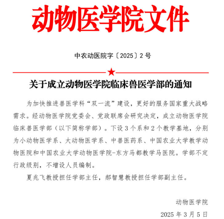 通知提到,为加快推进兽医学科“双一流”建设,更好的服务国家重大战略需求。经动物医学院党委会、党政联席会研究决定,成立动物医学院临床兽医学部(以下简称学部)。下设3个系和2个教学基地,分别为小动物医学系、大动物医学系、中兽医药系、中国农业大学教学动物医院和中国农业大学动物医学院-东方马都教学马医院。学部不定行政级别,不增设人员编制。夏兆飞教授担任学部主任,郝智慧教授担任学部副主任。