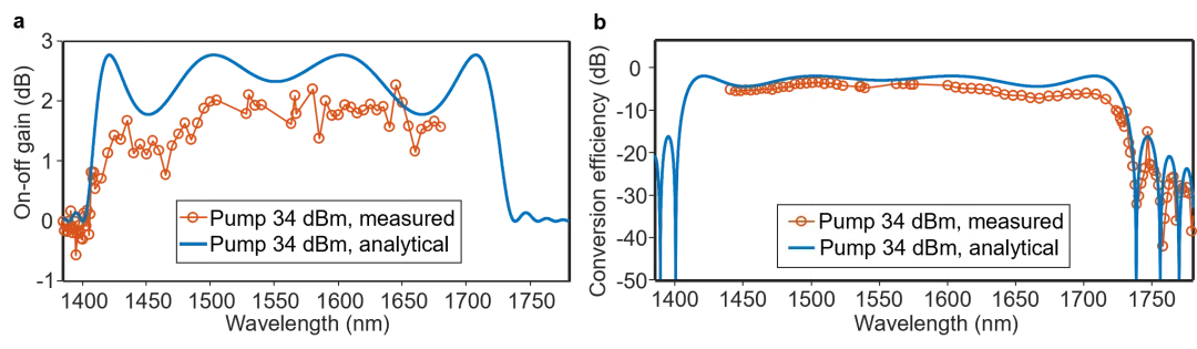 基于以上重大挑战,赵平团队提出基于“脊形减模 弯曲滤模”技术的单模、负色散非线性集成光波导设计普适性方法,原理上消除了过往参量放大非线性多模集成光波导中的随机模式串扰。团队以超低损耗非线性氮化硅集成平台为例,制备出具有平坦传输光谱的、单模负色散非线性集成光波导芯片,如图1所示。团队还进一步发展了非线性氮化硅集成光波导中模电模式基模(te00)二阶与四阶色散精确协同调控技术,实验中实现了带宽高达330nm的片上光参量放大,如图2所示。该项研究为新一代超大带宽光放大提供了新思路,在提升光纤/无线光通信容量,扩大数据中心光互连规模,提高光学测量精度,拓展光谱检测分析范围等方面有良好的应用潜力。