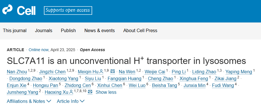 浙江大学医学院徐浩新教授团队鉴定了一种非经典的溶酶体氢离子泄露途径的分子基础——slc7a11,并揭示了此通路参与溶酶体和细胞功能调控的机制,以及其在神经退行性疾病的病理进程的关键作用,发表了题为“slc7a11 is an unconventional h transporter in lysosomes”的研究论文。徐浩新和浙江大学医学院胡美钦研究员为共同通讯作者,浙江大学医学院博士生周南、陈静芝、胡美钦为共同第一作者。