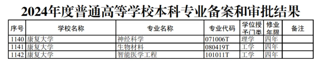 近日,教育部印发《关于公布2024年度普通高等学校本科专业备案和审批结果及〈普通高等学校本科专业目录(2025年)〉的通知》,康复大学申报的神经科学、生物材料、智能医学工程三个专业获准设置。
