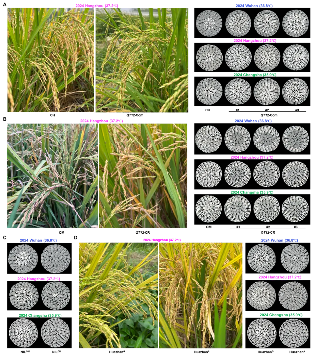 此外,qt12基因导入到杂交稻配组最多的主栽品种“华占”中的应用也取得了显著成效。与“华占”相比,在高温下其结实率、单株产量和稻米品质均明显提升,导致小区产量分别增加了49.1%、77.9%和31.2%;改良品系的稻米储藏物质营养更加均衡、外观品质晶莹剔透、米饭食味性好,进一步验证了其在高温环境下优质、高产、抗高温的综合育种实力。