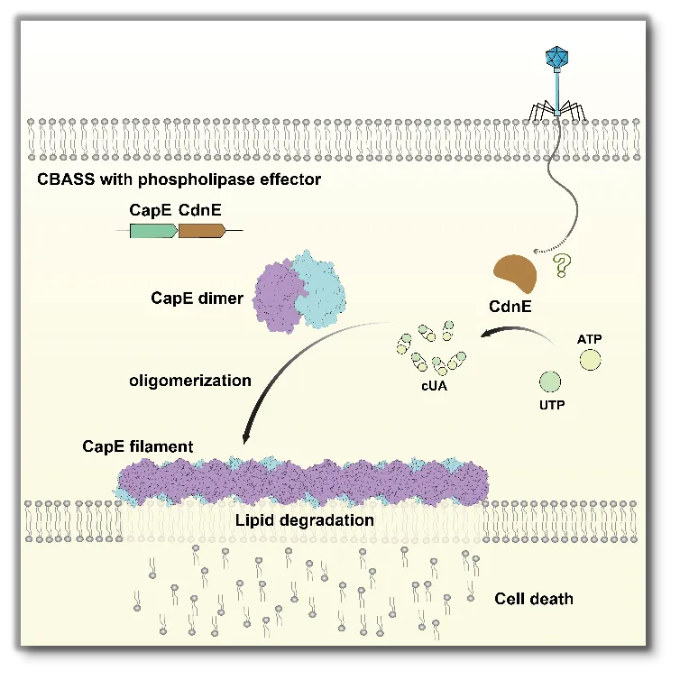 亿万年的时间里,噬菌体与细菌之间不断进行着攻击-防御-反击的战斗。为了阻止噬菌体入侵,细菌进化出一系列复杂而精巧的抗噬菌体防御系统,又被称为“原核生物的免疫系统”。其中,基于环状寡核苷酸的抗噬菌体信号传导系统(cbass,cyclic-oligonucleotide-based anti-phage signaling systems)备受关注。该系统在响应噬菌体感染后被激活,通过合成环状寡核苷酸第二信使分子,迅速放大信号,进而激活下游效应蛋白,引发细胞杀伤作用,导致细菌在噬菌体复制完成前死亡,阻止了噬菌体的复制和扩散。