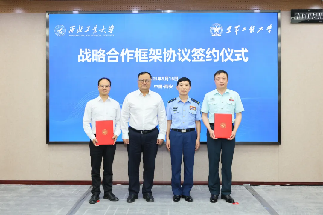 5月16日上午,西北工业大学与空军工程大学合作框架协议签约仪式在友谊校区举行。西北工业大学校长宋保维,空军工程大学校长杨学锋、副校长周义建参加签约仪式。座谈会由西北工业大学副校长王伶主持。