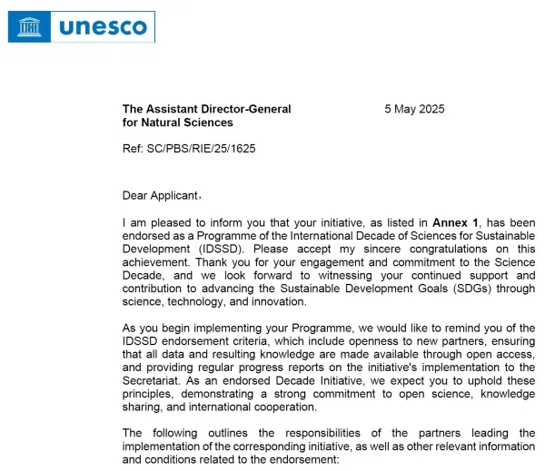 据悉,联合国《2024—2033年科学促进可持续发展国际十年》决议于2023年8月在联合国大会通过,旨在通过科学促进全球合作,以实现未来可持续发展。为落实该倡议,联合国教科文组织(unesco)于2023年10月正式启动“科学十年”项目征集工作。经过全球范围的严格遴选,包括本计划在内的第一批25个计划入选“科学十年”首批清单。