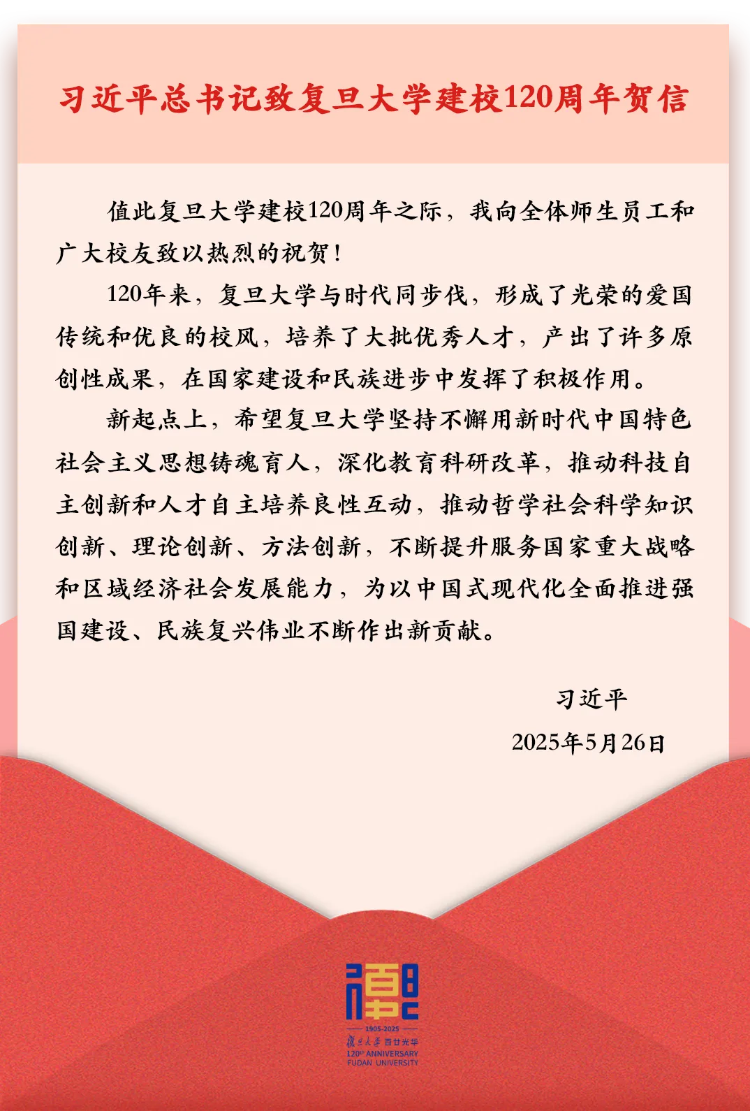 5月26日,中共中央总书记、国家主席、中央军委主席习近平给复旦大学建校120周年发来贺信,向全体师生员工和广大校友致以热烈的祝贺,对复旦120年的办学成就给予高度评价,同时也寄予了殷切期望。