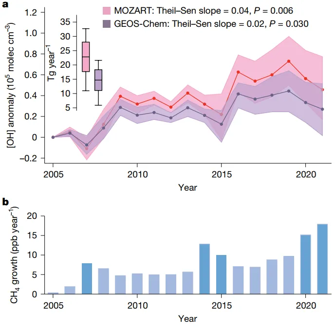图1.全球对流层oh自由基年际变化(a) 和ch4增长速率(b)
