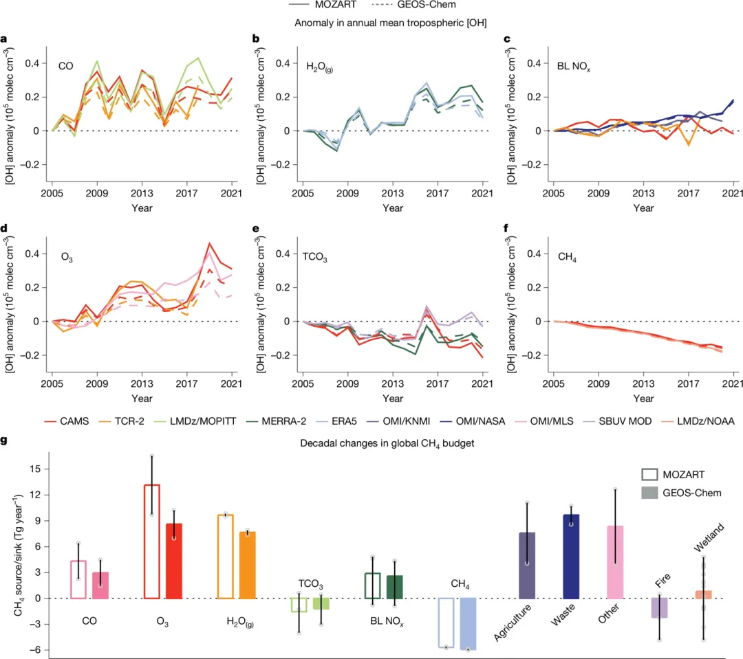 甲烷作为全球第二大温室气体,大气中甲烷浓度的快速上升已成为气候变暖的重要推动力,准确理解甲烷源汇过程及其调控机制是开展气候变化治理的关键。大气中羟基(oh)自由基是甲烷最主要的汇,当前对其浓度水平及时空变化趋势的认知尚不清晰,对影响全球oh自由基变化的主控因子理解不足,制约了对甲烷浓度增长速率年际变率的准确理解。为解决这一问题,研究团队自主研发了基于模型与数据双驱动的全球大气oh自由基量化表征系统,系统量化了2005-2021年间臭氧(o3)、一氧化碳(co)等主要大气污染物对oh自由基和甲烷汇的影响。研究结果揭示了大气污染物调控oh自由基浓度水平及其时空变化,进而影响全球甲烷源汇收支的关键机制,阐明了近年来大气污染物在长期趋势上减缓甲烷增长,在特定时段推动甲烷浓度异常波动的复杂机制。