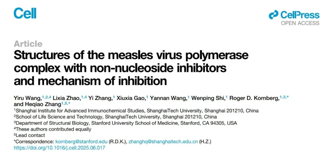 7月7日,国际学术期刊《细胞》(cell)在线发表了上海科技大学免疫化学研究所张贺桥与诺贝尔奖得主罗杰·科恩伯格(roger kornberg)团队的研究成果。该研究首次揭示了非核苷类抑制剂有效抑制麻疹病毒和尼帕病毒rna聚合酶复合物活性的分子机制,为应对这两种全球性传染病的抗病毒药物研发提供了关键科学基础。