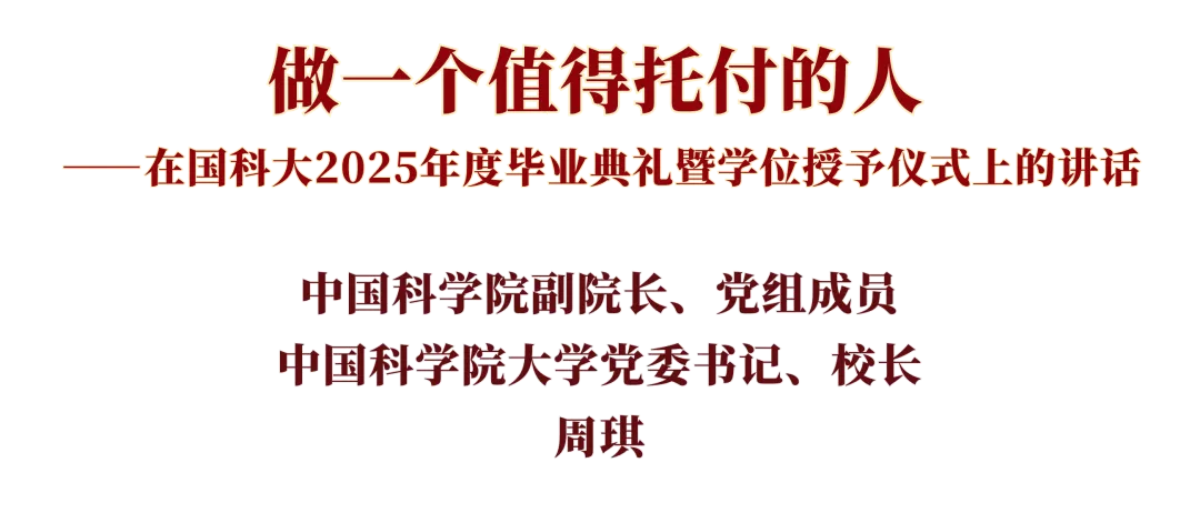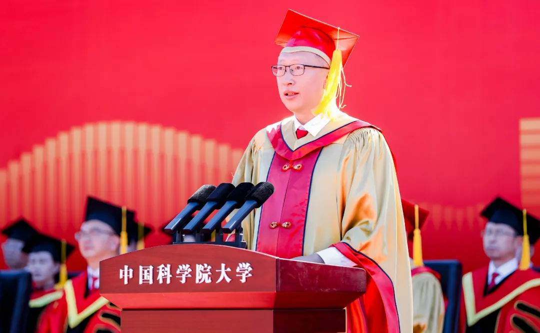 同学们,毕业不是终点,而是起点。国科大的求学阶段只不过让大家选择了前进方向,建立了独立学习和工作的能力,大家要学会自我管理、自我约束,不断学习。生逢伟大时代,科技创新是你们肩头最重的责任。面对全球变局与科技竞争,未来充满挑战,而挑战正是淬炼成长的催化剂。希望你们离开学校后仍不辍学习,不断进步,与时俱进,锻造解决真问题的真本领。希望你们要敢于打破常规,不惧未知、不怕失败,勇做破壁者,不做内卷者。今后你们无论在哪里、做什么,都不要忘记早已融入你们基因和血脉中的“两弹一星”精神,不要忘记早已打在灵魂深处的许身报国的烙印,不仅要扛起“卡脖子”难题,更要承担起抢占科技制高点的时代重任。