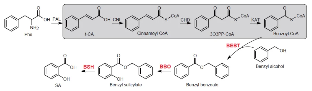 新鉴定的植物中水杨酸(sa)生物合成途径模型
