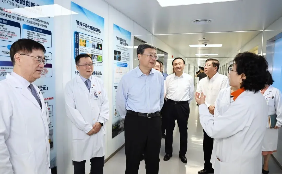 陈吉宁实地听取瑞金医院发展历程和总体情况介绍,走进转化医学中心察看人体数字代谢舱,了解临床研究型病房(床)建设和数字化能量代谢监测平台应用情况。这里集成了10个不同功能的智慧代谢舱体,可模拟不同环境,采集所需参数指标,满足各种科研需求。陈吉宁同研究团队深入交流,听取他们对科研组织、人才引育、队伍建设和激励机制的想法建议,叮嘱医院和相关部门负责同志要着眼临床研究实际和发展需要,加快优化调整科技创新机制、人事管理制度、人才评价制度,以制度改革创新更好激发人才内生动力,让大家专心致志投身医学科研创新、探索和抢占医疗最前沿,更好满足人民群众健康新需求。