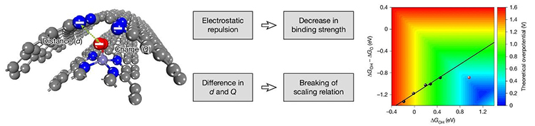 针对上述挑战,研究团队与合作者设计、合成了多层、曲面fe/n–c单原子催化剂。基于理论计算,团队外层石墨化碳壳层可产生额外静电排斥力,有效削弱氧还原反应中间体的结合强度。同时,电荷以及与外壳层距离的不同,会导致不同中间体所受到的排斥作用不同(0.63–1.55ev),从而打破传统的“线性标度关系”,理论过电位显著降至0.34v,催化活性大幅提升。此外,弯曲表面结构能够改变o-o键与o-fe键的相对强度,促进四电子还原途径,从而有效阻止羟基自由基(oh·)的大量生成,延缓铁位点的失活,催化稳定性显著提高。