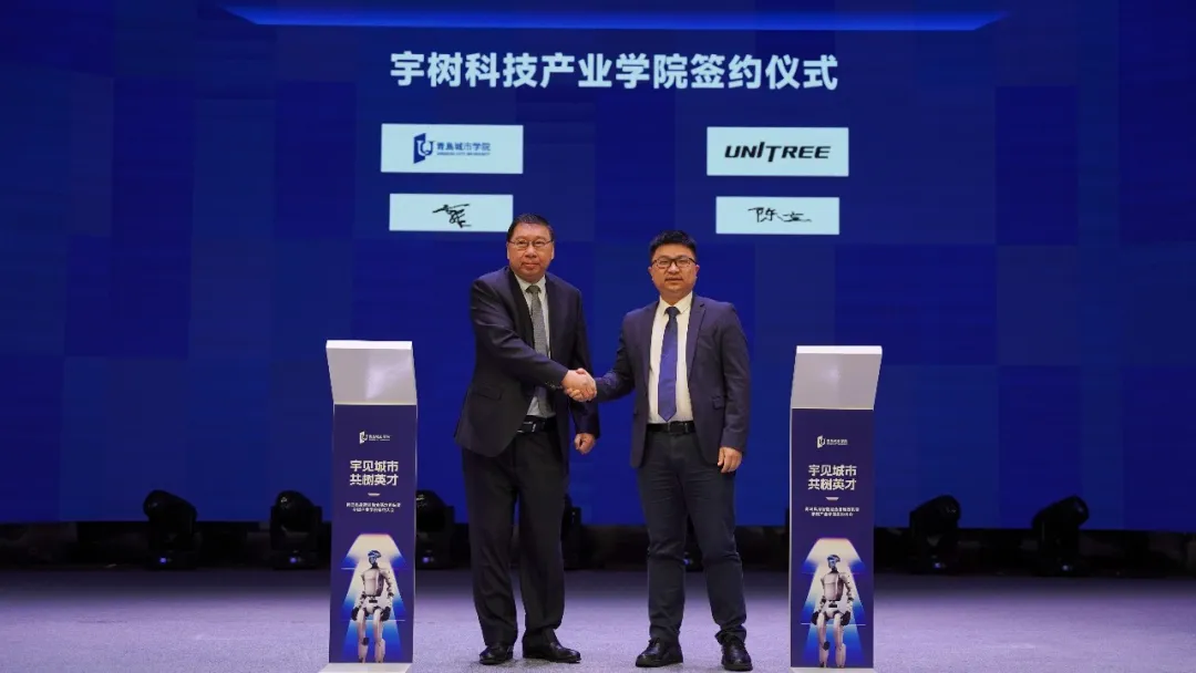 青岛城市学院校长郭凯佳教授与宇树科技联合创始人陈立先生共同签署协议,标志着双方的合作从单一项目向体系化、学院化深度融合的战略跨越,共同构建具身智能时代应用型人才培养的新范式。