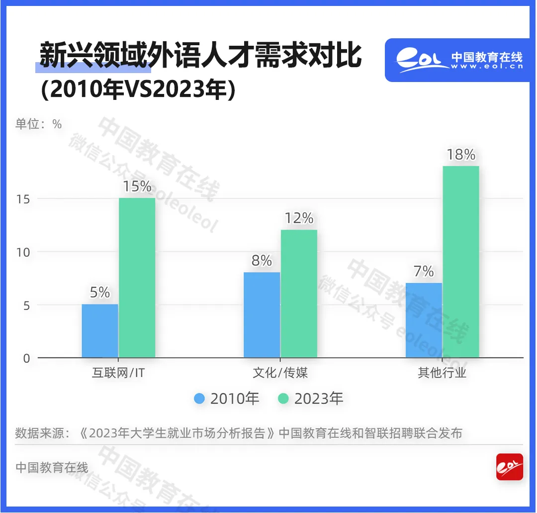 传统就业领域急剧萎缩。外贸/国际商务领域就业占比从2010年的28%降至2023年的18%;翻译/本地化服务领域从15%降至8%,几乎腰斩;教育培训领域从25%降至22%,k12英语培训更是断崖式下跌;旅游/酒店行业从12%降至7%。