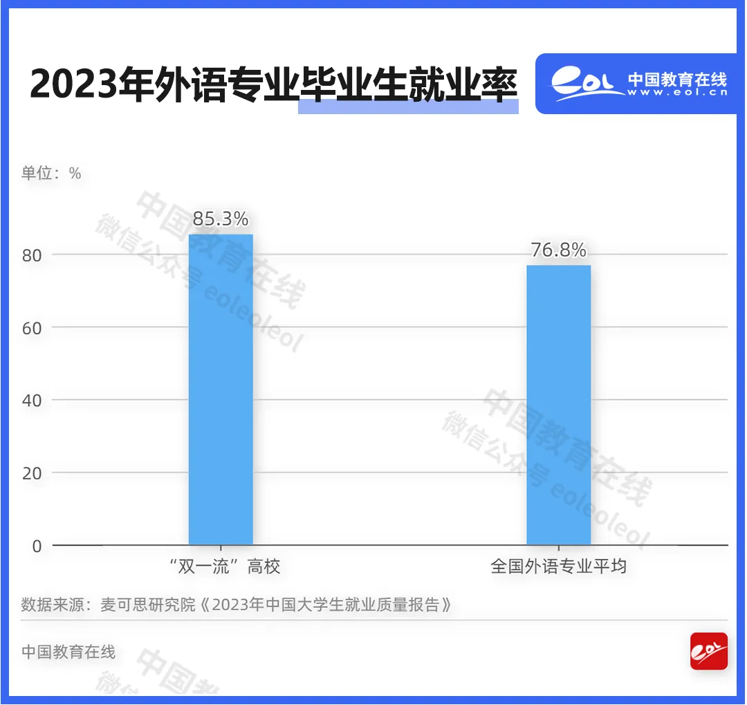加上贸易战和逆全球化的影响,外语专业的就业数据全面下滑:据麦可思研究院《2023年中国大学生就业报告》数据,外语专业的就业优势已经不复存在:2023年外语专业本科毕业生平均就业率仅为76.8%,低于全国平均水平5.6个百分点;专业对口率仅52%,近一半毕业生转行;专业满意度从2010年的78%降至67%,薪资增长也明显放缓。