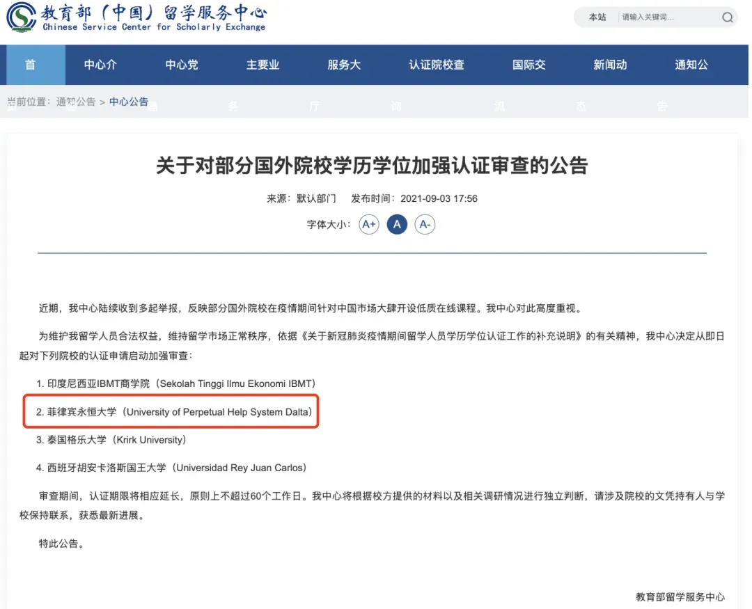 2021年9月3日,教育部(中国)留学服务中心网站发布《关于对部分国外院校学历学位加强认证审查的公告》,菲律宾永恒大学(university of perpetual help system dalta)就在名单中。