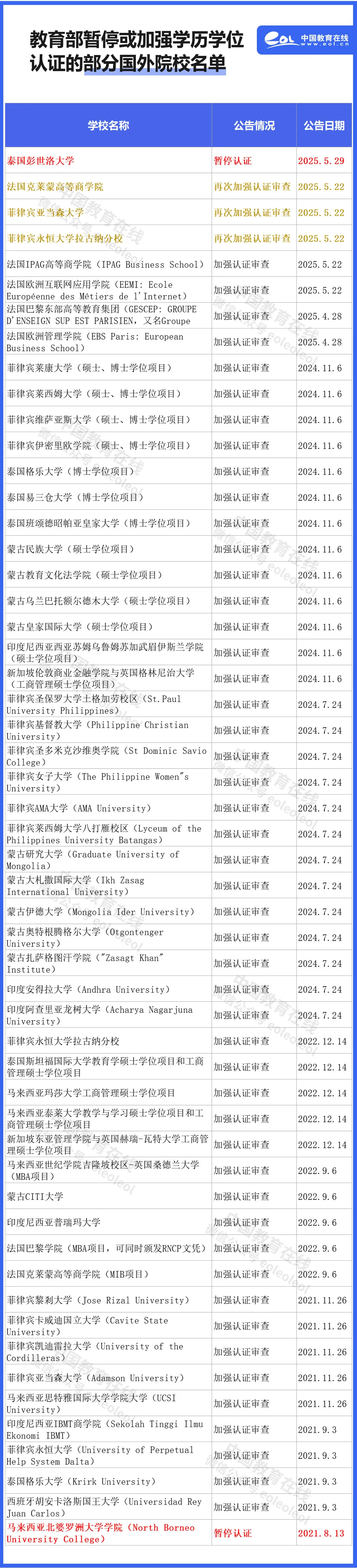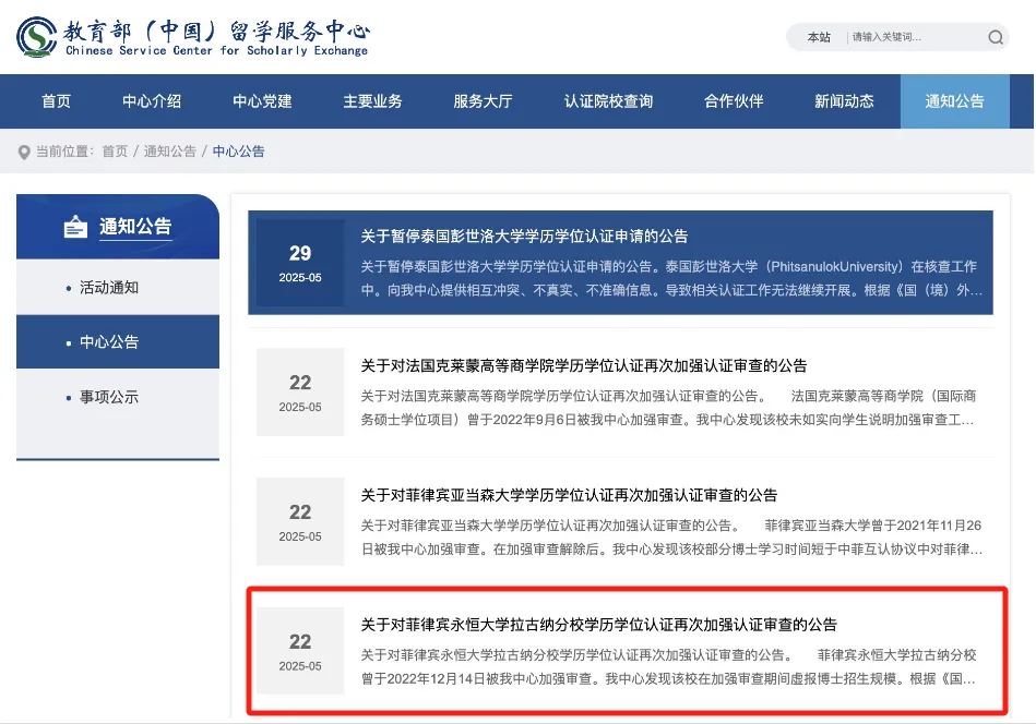 2025年5月22日,教育部留学服务中心发布多条关于海外高校学历学位认证再次加强认证审查的公告,其中就包括菲律宾永恒大学拉古纳分校。