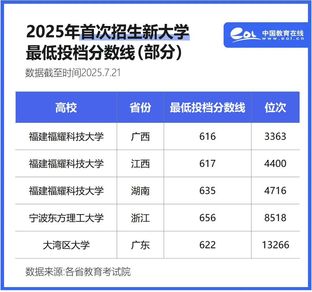 其中,福建福耀科技大学、宁波东方理工大学、大湾区大学这3所今年首次招生的新大学,凭借比肩甚至超越多所985高校的超高投档线,引发了广泛关注与热议。