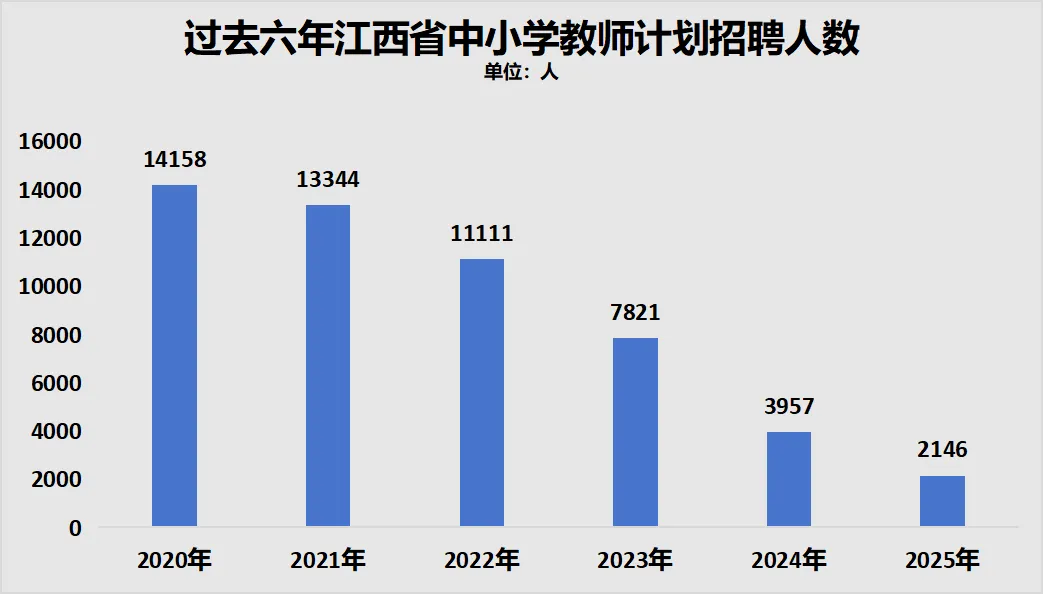 今年3月25日,江西省人力资源和社会保障厅kok登录官网披露:2025年江西省中小学教师招聘人数计划2146名。相比去年下降了45.8%,相比于2020年,则下降了84.8%。据统计,江西省教师招聘人数2020年达到近年来的高峰,之后一路下滑,过去三年下滑速度不断加快。