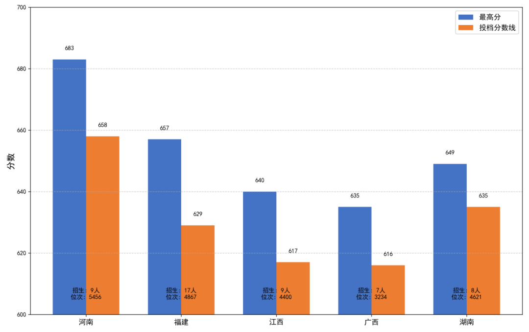在河南省录取的最高分达683分,位次857,最低投档线658分,位次5456;福建省最高分657分,位次1107,最低投档线629分,位次4867;湖南省最高分649分,位次2299,最低投档线635分,位次4621。在广西壮族自治区物理类最低投档线616分,位次3234,超越北京师范大学、华南理工大学、厦门大学等多所名校;江西省物理类最低投档线617分,位次4400,高于哈尔滨工业大学、山东大学、湖南大学等985名校。