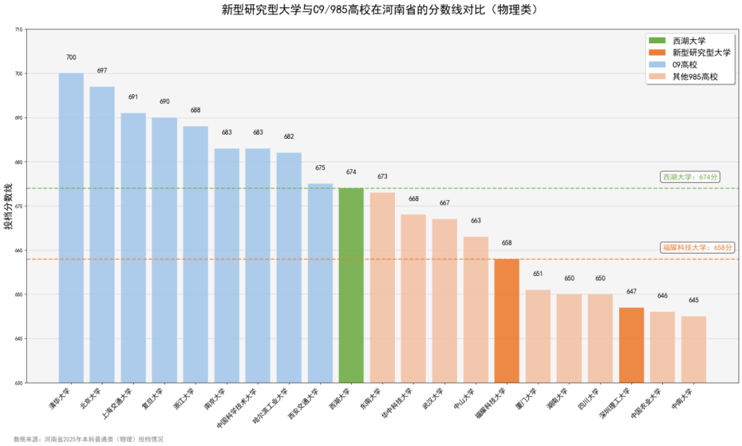 新型研究型大学与c9/985高校在河南省2025年本科普通类(物理)分数线对比图