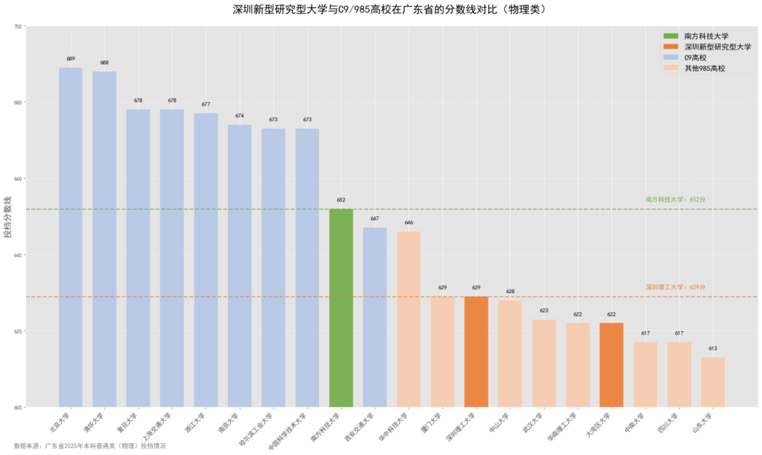 深圳新型研究型大学与c9/985高校在广东省2025年本科普通类(物理)分数线对比图