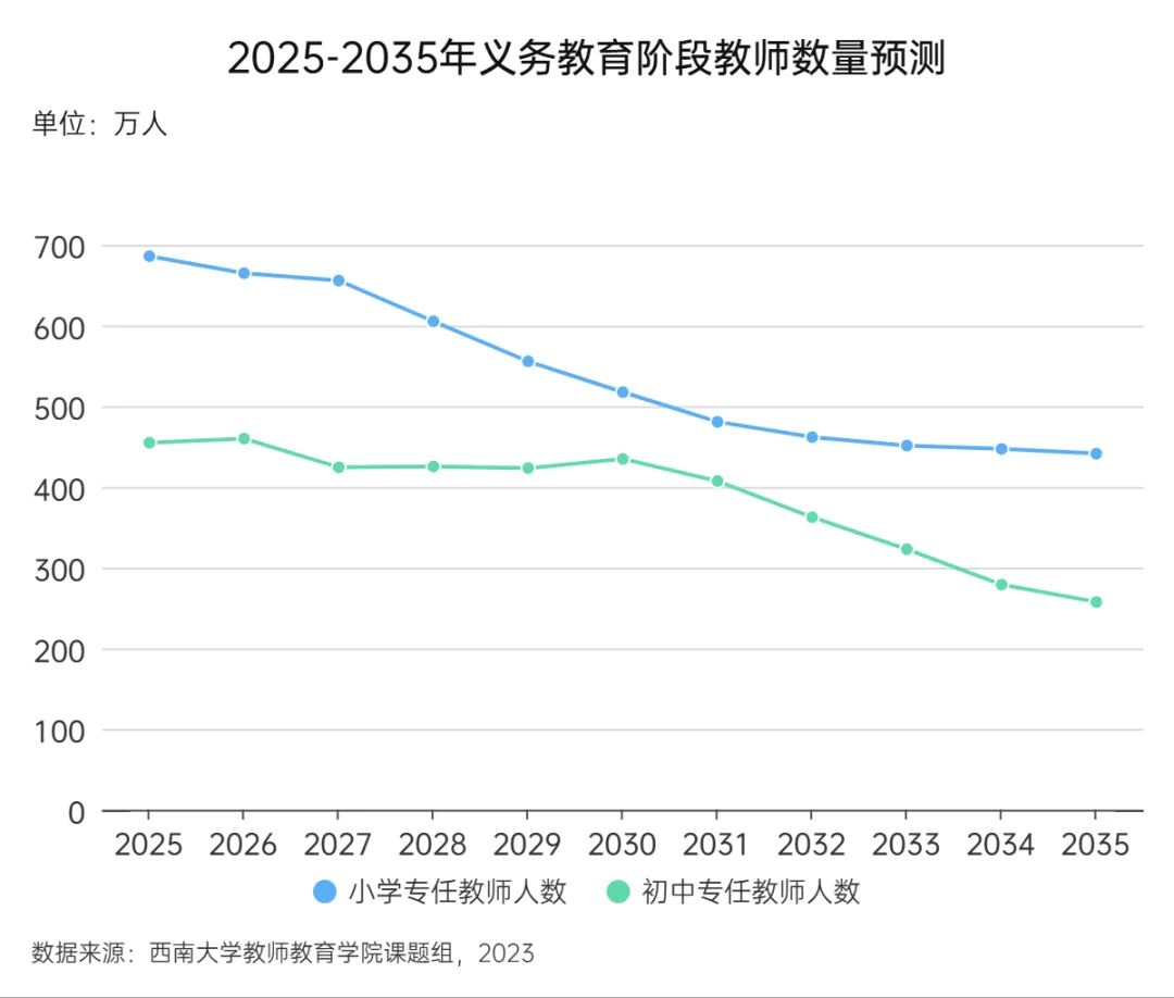 这一趋势在西南大学一项研究的预测中得到进一步印证。基于生师比和班级规模的国际比较,他们对义务教育阶段教师需求进行了动态测算:小学教师需求在2023-2024年见顶,约686万人,此后将持续减少;而初中教师需求在2026年达到峰值,约460万人,之后也会逐渐下降。