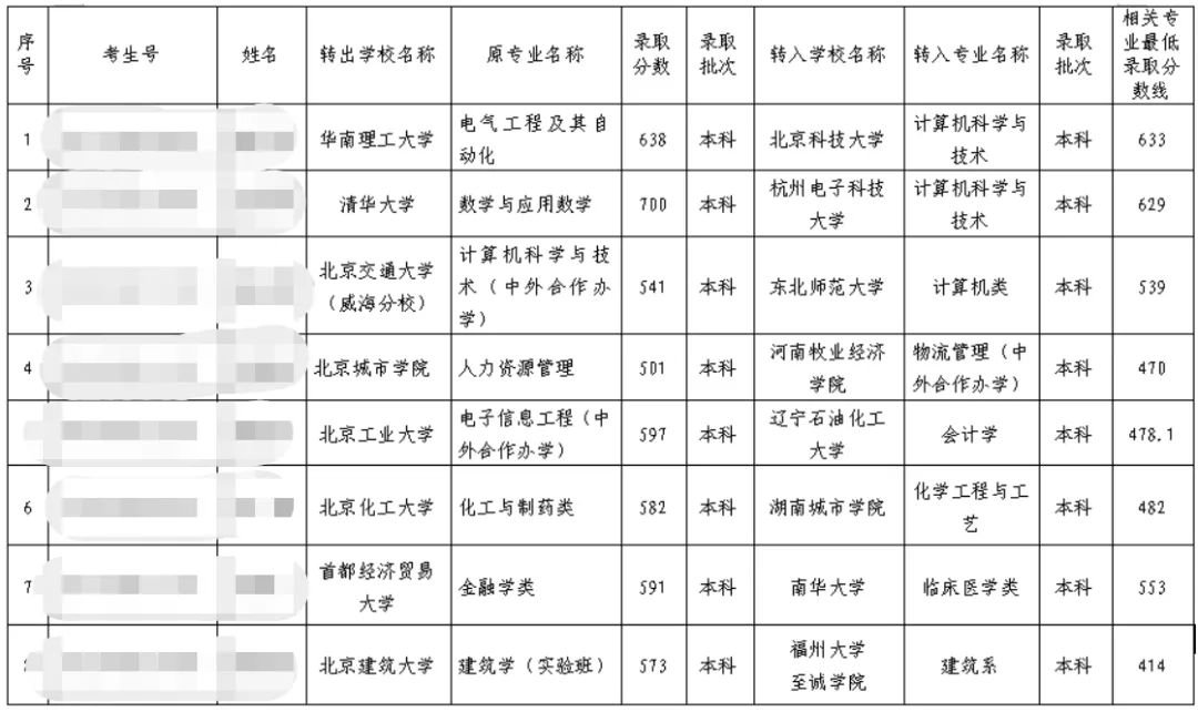 更早前,2023年7月10日,北京市教育委员会也曾公布了一批跨省转学公告,均为降格转学:有人从北京航空航天大学自动化专业转到了西南大学统计学专业,有人从北京外国语大学外交学专业转到了沈阳工业大学英语专业,还有人从北京理工大学智能无人系统专业转到了江苏师范大学电子信息工程专业。