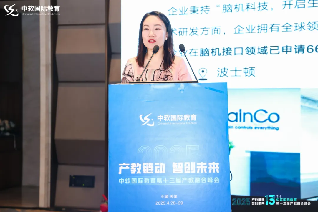 强脑科技高级副总裁杨承君围绕“脑机接口高校教育与应用创新探索”做了主题报告并现场演示结合脑机接口和ai算法的智能仿生手。杨承君介绍,brainco强脑科技创立于2015年,是首家入选哈佛大学创新实验室(harvard innovation lab)的中国团队,也是全球非侵入式脑机接口技术领军企业。企业秉持“脑机科技,开启生命更多可能性”的使命,成立十年来致力于将实验室里的技术应用于现实,带来真实世界的影响。她指出,脑机行业作为新质生产力代表性产业,受到国家重点关注,同时相关企业在技术创新和产业升级过程中对拔尖人才的需求也日益紧迫。强脑科技携手中软国际教育科技集团,依托双方资源及技术优势,与院校进行深度融合,以脑机接口 人工智能 x专业模式,促进产学研协同发展,助力高质量复合型人才培养,赋能千行万业。