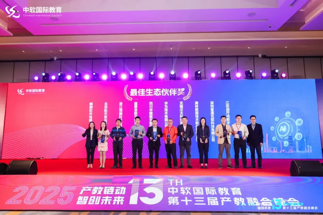独行快,众行远。产教生态的繁荣,离不开企业对教育事业的倾情投入。典礼现场,中软国际教育科技集团还为江苏润开鸿数字科技有限公司、深圳慧通互联科技有限公司、美林数据技术股份有限公司、无锡泛太科技有限公司、华为技术有限公司、四川华鲲振宇智能科技有限责任公司、超聚变数字技术有限公司、浙江强脑科技有限公司、北京航天紫光科技有限公司、麒麟软件有限公司颁发“最佳生态伙伴奖”。获奖伙伴通过深度协作开发特色化联合方案,实现了"技术共研、市场共拓、价值共享"的生态合作新范式。