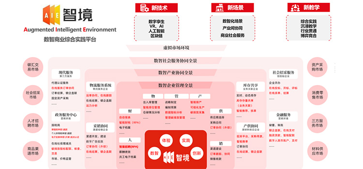 aie智境—数字商科仿真模拟实训的开展是学校教育改革的一次重要尝试,也是实验教学改革的一次重要探索。aie智境是新道科技推出的新一代数智商业综合实践教学平台。平台深度融合数字孪生、虚拟现实、大数据、人工智能等前沿技术,以开放性架构和丰富行业案例,支撑院校开设跨专业综合实践课程,致力于培养精通商业运作、掌握数字技术的复合型数智人才,助力教育数字化战略行动落地与产业升级人才需求对接。