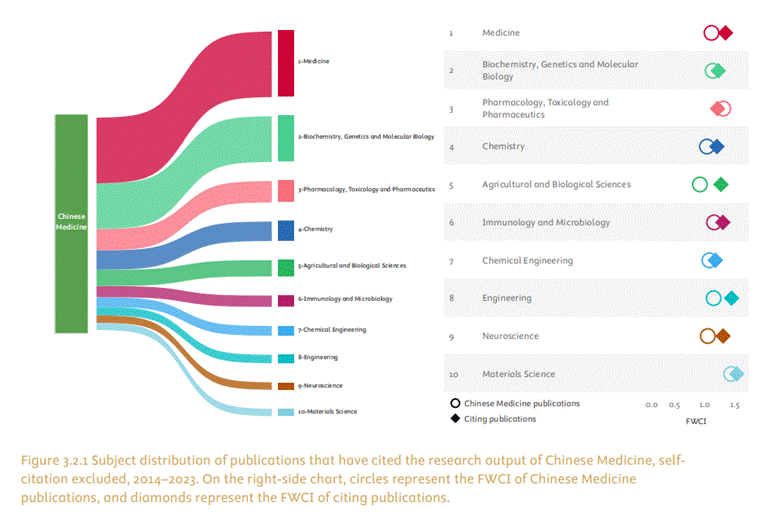 在学术影响力方面,中医药研究的被引用足迹遍布诸多学科。剔除领域自我引用后,引用中医药成果的论文中,医学领域以 46.8% 的比例占据最大份额,生物化学、遗传学与分子生物学以 32.5% 紧随其后;药理学、毒理学与药剂学、化学、农业与生物科学、免疫学与微生物学等也表现出不同程度的交互。大多数学科的施引文献其归一化引文影响力(fwci)高于被引的中医药原文献,特别是工程与材料科学领域的施引文献fwci 最高,说明中医药研究不仅被多学科借鉴,还在推动这些领域的知识进步。