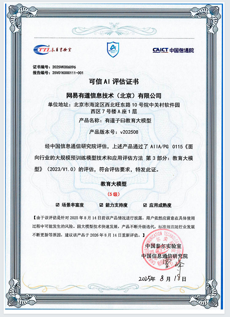 通过教育智能硬件与ai应用软件的多维创新发布,有道再次展现出其在教育大模型应用的前沿领军能力。在技术层面,有道也在持续不断优化迭代。据透露,有道子曰教育大模型已首批通过中国信通院可信ai教育大模型评估,并获得了当前最高评级5级。