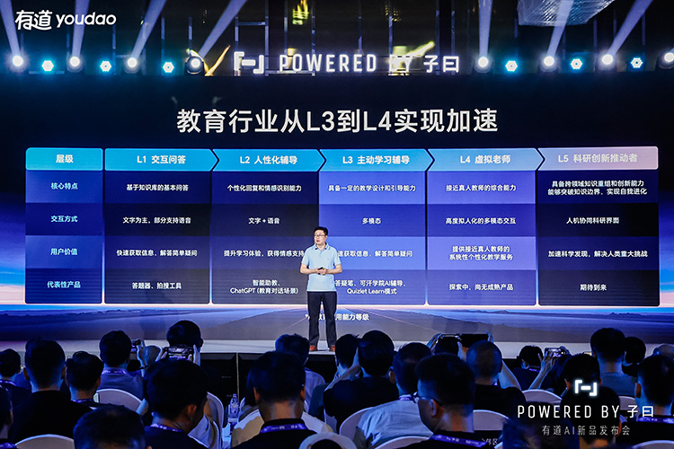 会上,网易有道ceo周枫提出教育ai应用能力l1-l5分级标准,并指出,目前教育ai正加速升级,将带来千人千面的个性化课堂,让家庭学习更高效,让教师拥有随时在线的“超级智脑助手”。