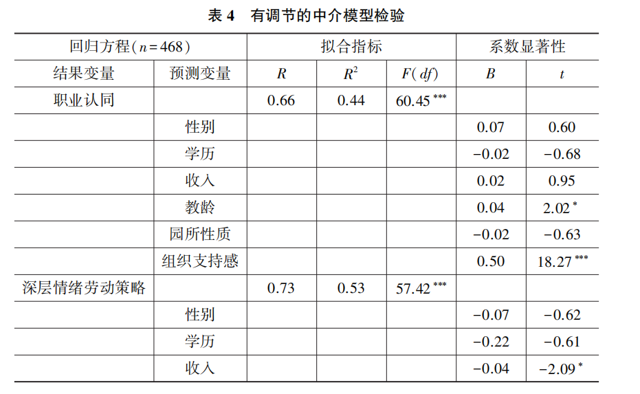 在控制性别、年龄、收入、教龄、学历、园所性质的情况下对职业认同在组织支持感与深层情绪劳动策略关系中的中介效应进行检验。结果显示,组织支持感对职业认同的正向预测作用显著(标准化回归系数为b=0.61,t=18.27,p<0.001),职业认同对深层情绪劳动策略的正向预测作用也显著(标准化回归系数为b=0.68,t=13.80,p<0.001)。