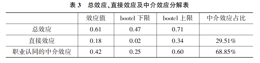 接着对中介效应大小进行进一步检验,结果表明(见表3),组织支持感对深层情绪劳动策略的预测作用显著(标准化回归系数b=0.61,95%ci为[0.47,0.71],p<0.001),且当放入中介变量后,组织支持感对深层情绪劳动策略的直接预测作用依然显著(标准化回归系数b=0.18,95%ci为[0.02,0.34],p<0.001);职业认同的中介效应显著(标准化回归系数b=0.42,95%ci为[0.25,0.60],p<0.001)。组织支持感对深层情绪劳动策略影响的直接效应及职业认同的中介效应的bootstrap95%置信区间的上、下限均不包含0,表明组织支持感不仅能够直接预测深层情绪劳动策略,而且能够通过职业认同的中介作用预测深层情绪劳动策略。该直接效应(0.18)和中介效应(0.42)分别占总效应(0.47)的29.51%、68.8%。