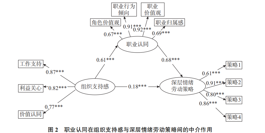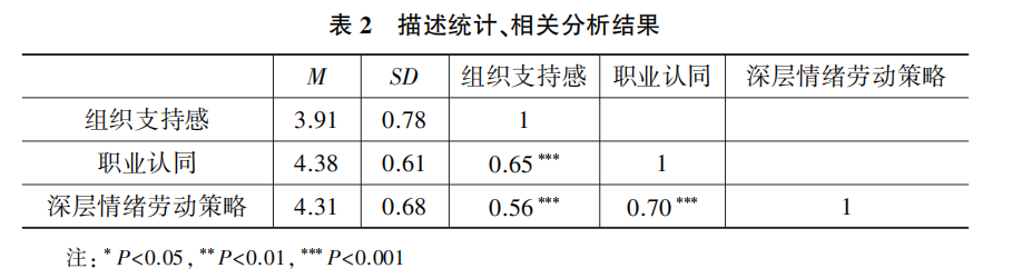 各变量的平均数、标准差及相关矩阵描述及相关分析结果(见表2)表明,组织支持感与职业认同之间呈显著正相关(p<0.001),与深层情绪劳动策略呈显著正相关(p<0.001),职业认同与深层情绪劳动策略之间呈显著正相关(p<0.001)。