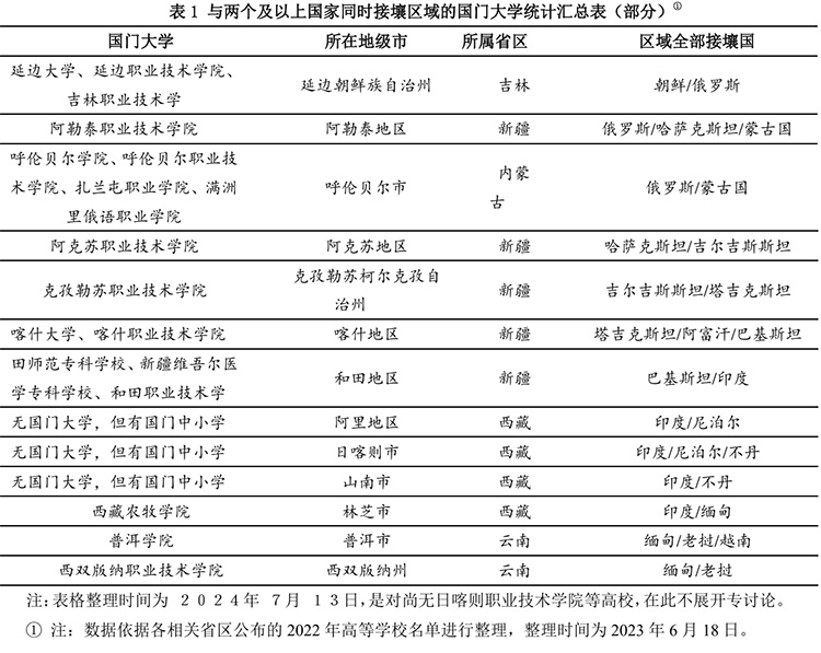 国门历久便是国与国之间文教互动、人员互访、贸易互联的重要通道所在。而以学校为载体而生发和承载的文教交互,则是国境区域各类交互中影响最为持久和深远的。客观来看,我国的国门区域也是接壤国的国门区域。现实中,多所国门大学所处州市同时和多个国家接壤,普遍存在与多个国家同时形成交互往来的情形。典型的如延边大学位居吉林省延边朝鲜族自治州,东与 俄罗斯滨海边疆区接壤,南隔图们江与朝鲜咸镜北道、两江道相望,早在1989年便与朝鲜的金日成综合大学建立了交流合作关系,当前更是与毗邻的韩国80余所高校开展交流合作,形成了区域性的国门教育高地;喀什大学位居新疆喀什地区,和塔吉克斯坦、阿富汗、巴基斯坦3国同时接壤,先后与巴基斯坦战略研究中心、巴基斯坦国防大学、巴基斯坦科技大学等20余所高校和国家智库建立了交流合作关系,形成了中巴经济走廊建设的积极助推;普洱学院位居云南省普洱市,和缅甸、老挝、越南3国同时接壤,长期坚持面向澜湄流域开放办学,老挝留学生人数居全国前列,对中老铁路沿线的文教辐射和国家软实力输出贡献了积极的力量。依托这些国门学校,相关区域在客观上形成了我国文教事业“一对二”乃至“一对多”的窗口示范。故从这个意义上看,各类国门学校理应在相关区域的国际间政治、经济,尤其是文教事业交互上做到“出得去、守得住、进得来”,既可持续推动我国教育文化科技等事项的“走出去”,也能在文教交互上拱卫我们自己的“精神领土”,同时还能吸引接壤国家和毗邻地区的先进事项和文明成果,在发展定位上切实担负起国家外向交往的窗口效用和示范效用。详如表1所示: