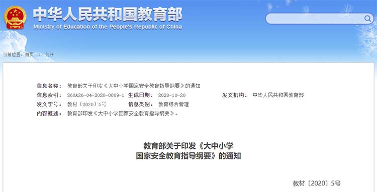 为深入学习贯彻习近平总书记总体国家安全观,结合教育系统实际,2020年9月,教育部印发了《大中小学国家安全教育指导纲要》(以下简称指导纲要)。指导纲要落实中央关于加强大中小学国家安全教育和《中华人民共和国国家安全法》提出“将国家安全教育纳入国民教育体系”的要求,针对有些地方和学校对国家安全教育重视不够,落实不到位,以及不够全面、系统,未实现全覆盖等问题,整体规划设计国家安全教育,进一步明确地方和学校的教育责任。