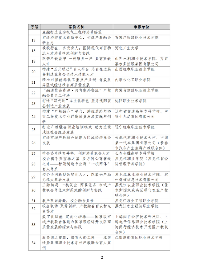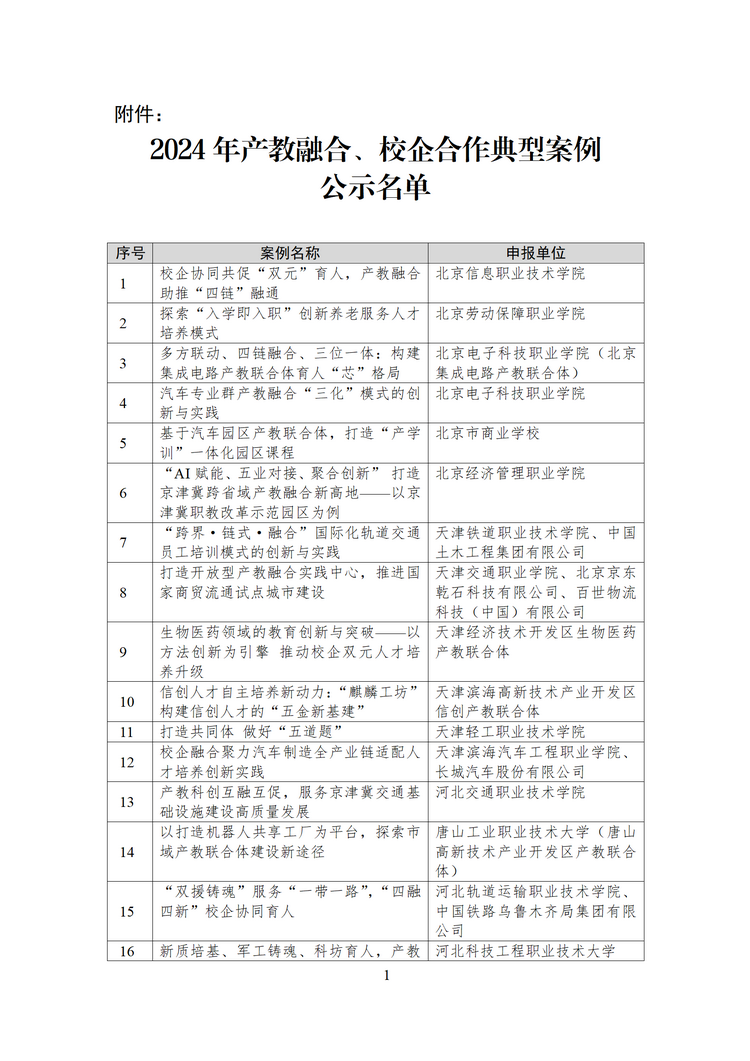 根据《关于征集产教融合、校企合作典型案例的通知》要求,在各省级教育行政部门、各计划单列市教育局推荐的基础上,经资格审查、专家评议等程序,拟确定133个产教融合、校企合作典型案例(排名不分先后,名单见附件),现予以公示,公示期为2024年12月10日至12月16日。