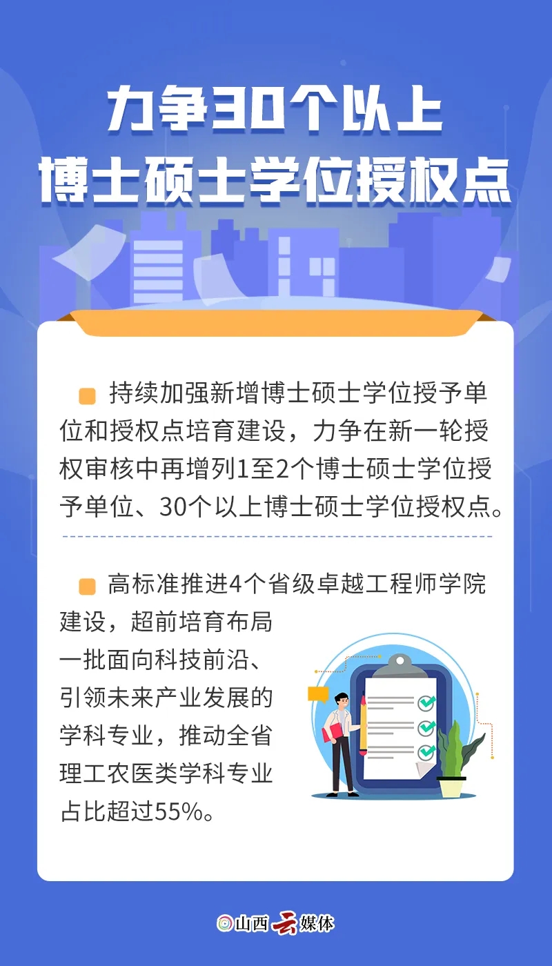 二是聚焦教育科技人才一体发展,深入推进实施百亿工程,持续优化高校布局结构,加快调整学科专业,系统推进高校科技创新,着力构建现代职业教育体系,多措并举促进高校毕业生就业创业,在支撑全省全方位转型上展现更大作为。