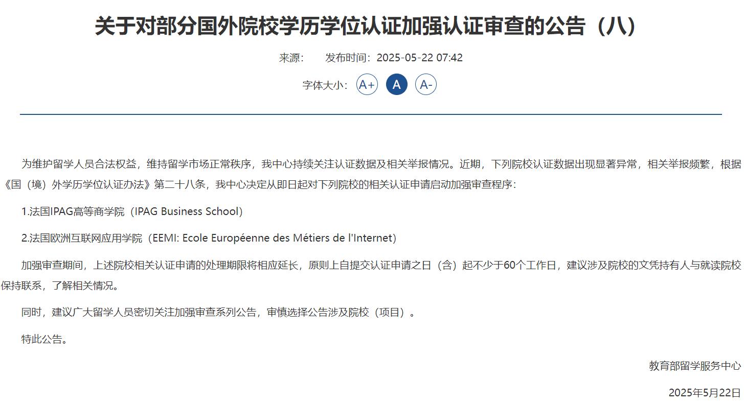 5月22日,教育部留学服务中心发布多条关于对海外高校学历学位认证再次加强认证审查的公告。其中涉及包括法国ipag高等商学院、法国欧洲互联网应用学院、菲律宾永恒大学拉古纳分校、菲律宾亚当森大学、法国克莱蒙高等商学院等。