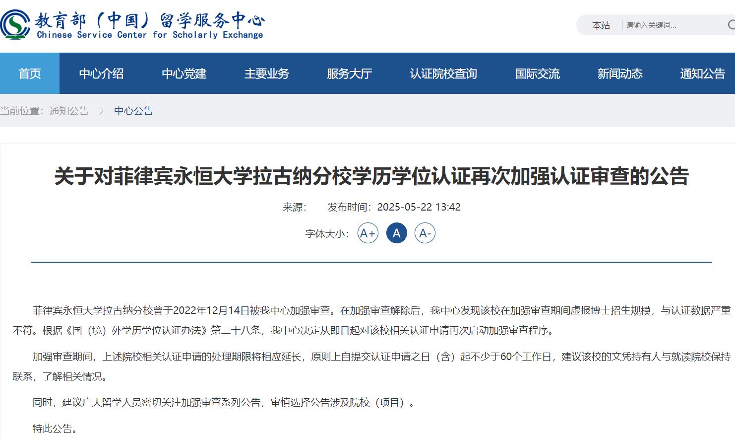 菲律宾永恒大学拉古纳分校曾于2022年12月14日被我中心加强审查。在加强审查解除后,我中心发现该校在加强审查期间虚报博士招生规模,与认证数据严重不符。根据《国(境)外学历学位认证办法》第二十八条,我中心决定从即日起对该校相关认证申请再次启动加强审查程序。
