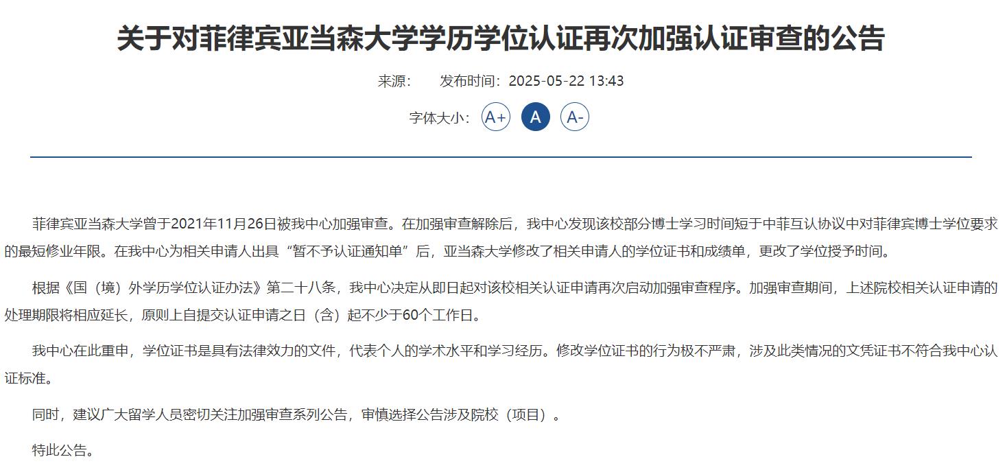 关于对菲律宾亚当森大学学历学位认证再次加强认证审查的公告
